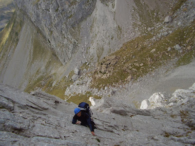 El IX largo es fácil, es una chimenea, casi todo andar menos un par de pasos y el siguiente largo también es casi todo andar menos un paso de IV; cuando acabamos el X largo nos damos cuenta de que es bastante tarde y nos queda muy poco tiempo de luz, así que el XI largo lo subimos todo lo rápido que pudimos, solo quedaba el largo XII que era un poco de trepada al principio y luego andar hasta la cima, este largo lo subimos sin asegurarnos.
